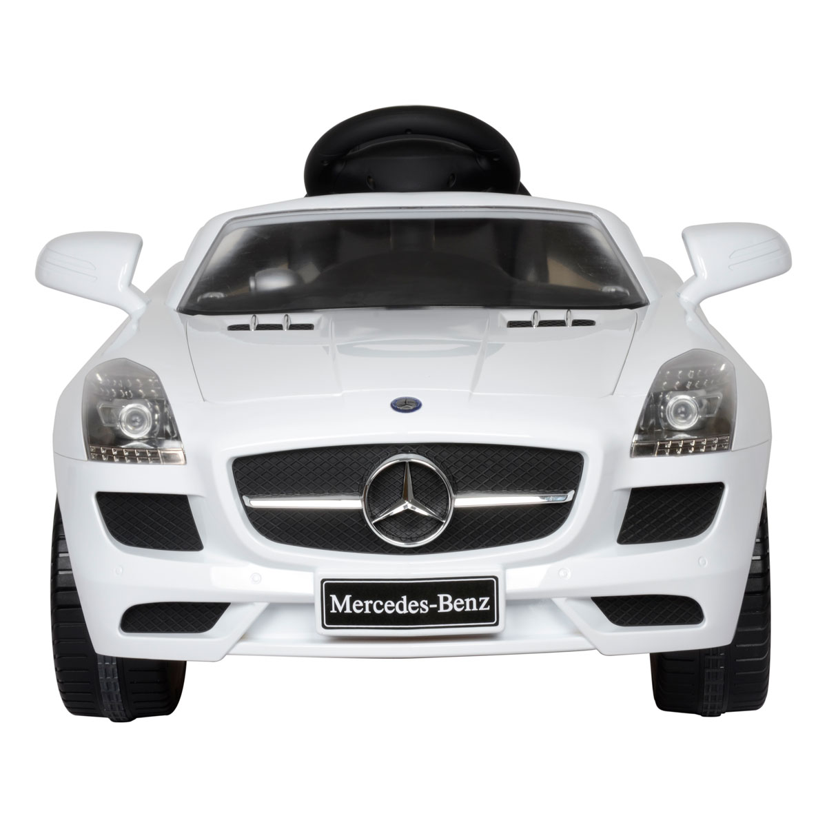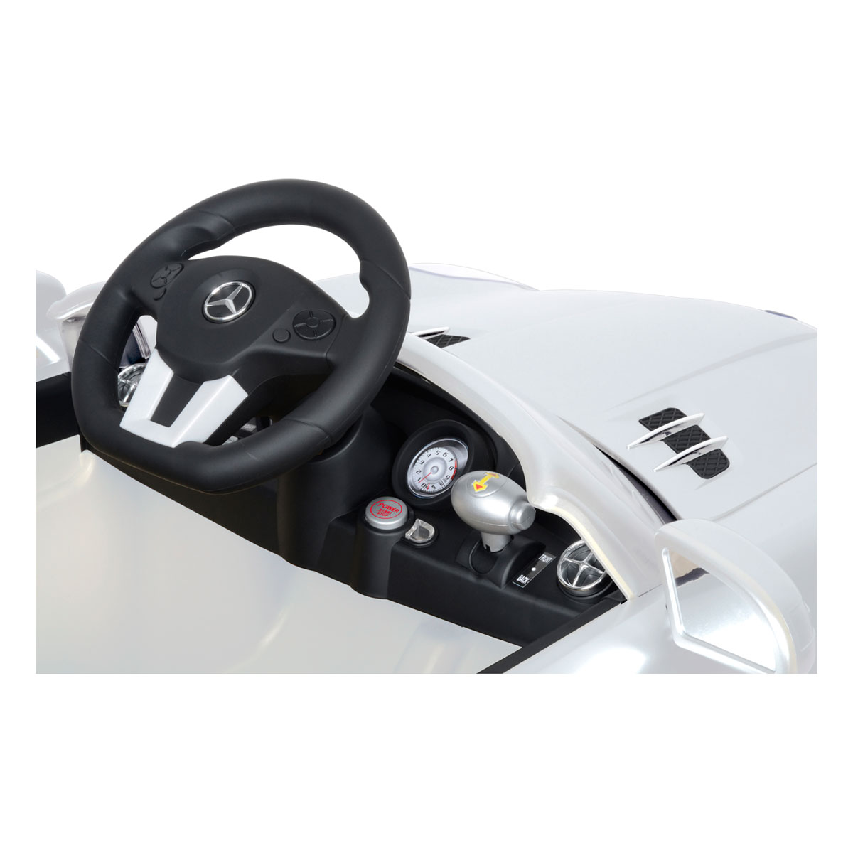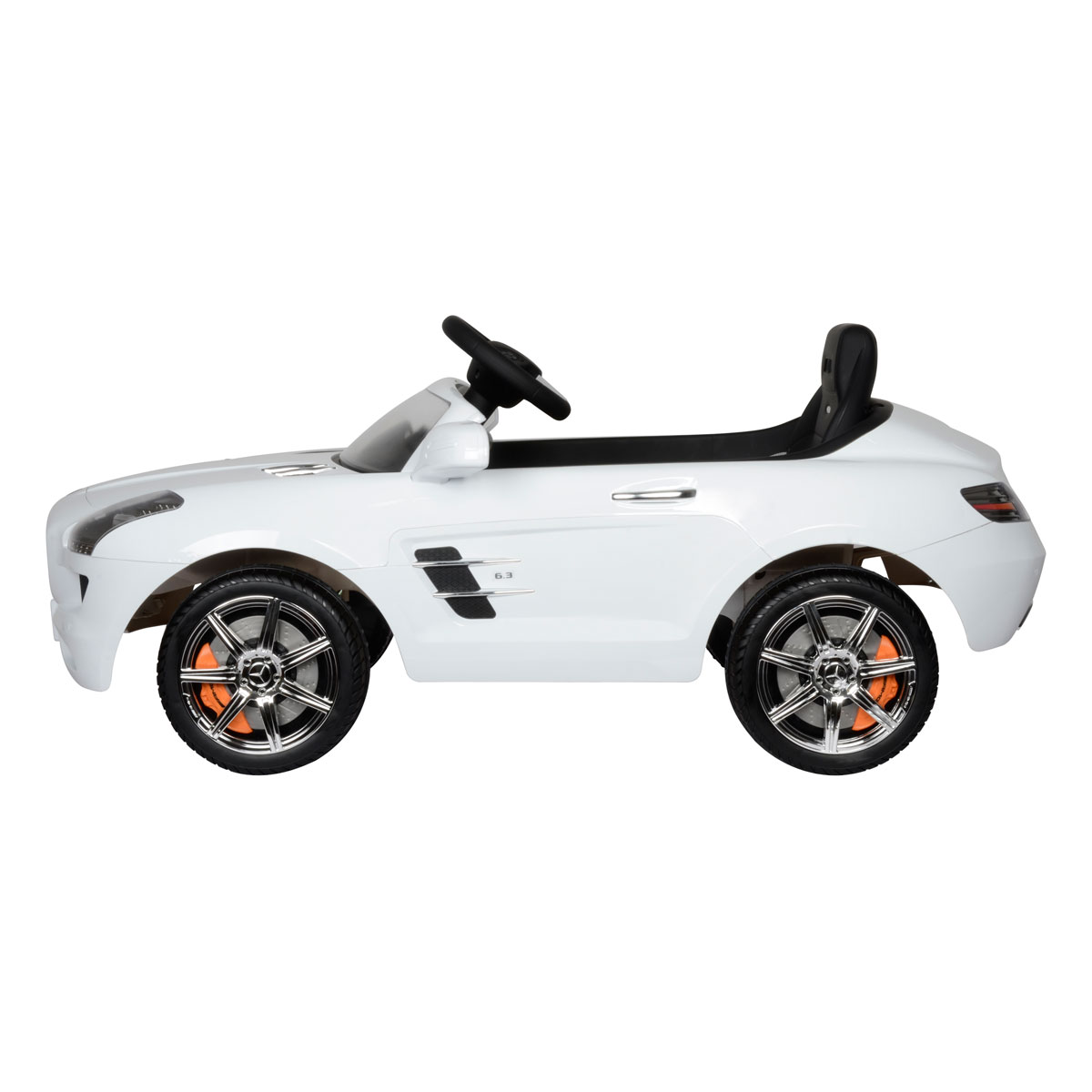 Představujeme ti nové elektrické autíčko MERCEDES-BENZ SLS, jedná se o zmenšenou kopii sportoního auta od německého výrobce MERCEDES-BENZ. Vezmi si klíčky, sedni za volant a nastartuj, slyšíš zvuk motoru? Připoutej se pásem, sešlápni plyn a hurá na výlet. Jako ve skutečném autě, i zde si můžeš pustit muziku a pokud tě omrzí, můžeš připojit MP3 přehrávač nebo telefon se svými oblíbenými písničkami. Když ti bude někdo překážet v cestě, zatrub nebo zablikej. Pokud chceš někam zajet, ale nechce se ti řídit, dej rodičům ovladač do ruky a nech se vozit. Až se vrátíš, musíš autíčko nabít. Nabíječka je součástí balení a nabíjecí konektor najdeš pod víčkem nádrže na boku auta.