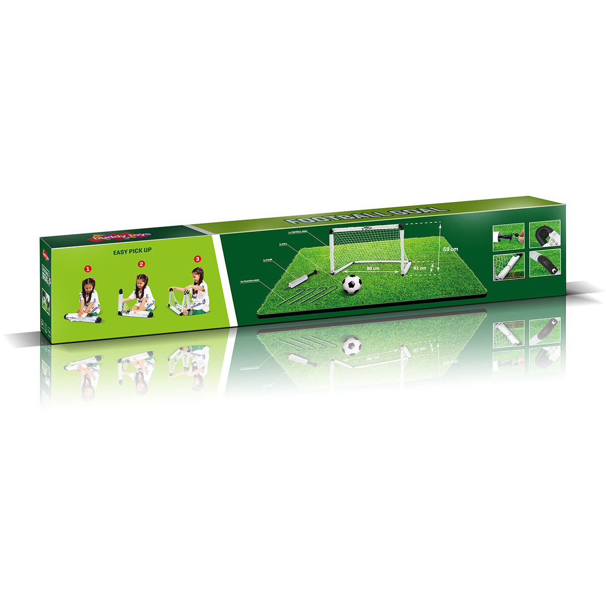 Balení obsahuje fotbalovou branku, malý nafukovací míč, pumpičku a ukotvení do trávy.