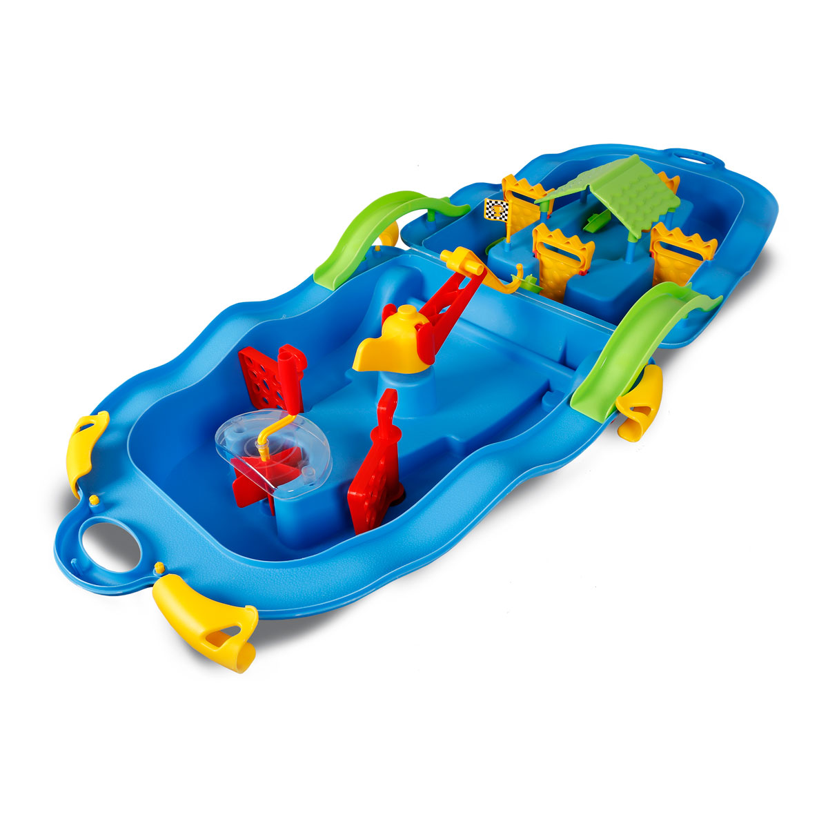 Vodní dráha s mostem a jeřábem. Vše je uloženo v praktickém kufříku na kolečkách. Snadné smontování pomocí klipů, ruční klika pro tvorbu proudění. Vhodné pro děti od 3 let