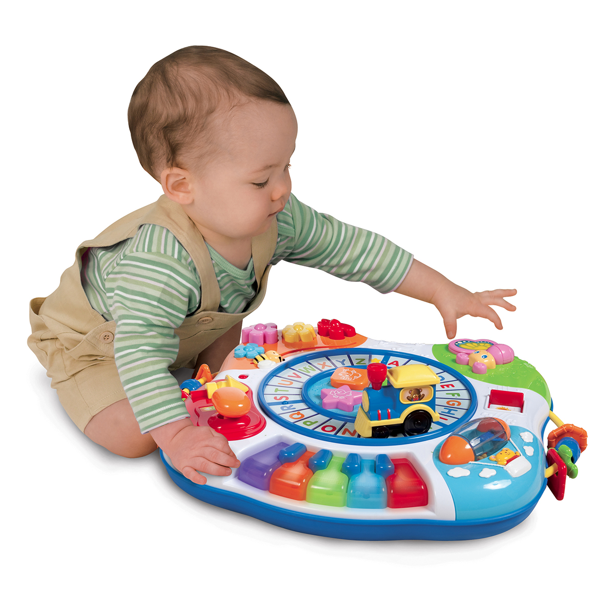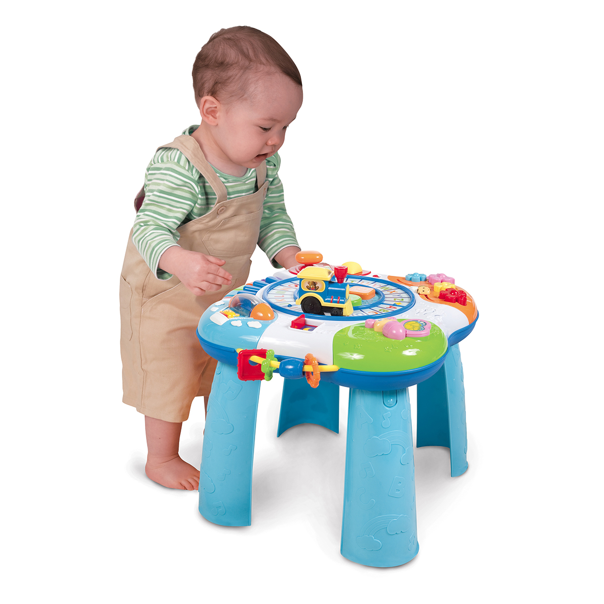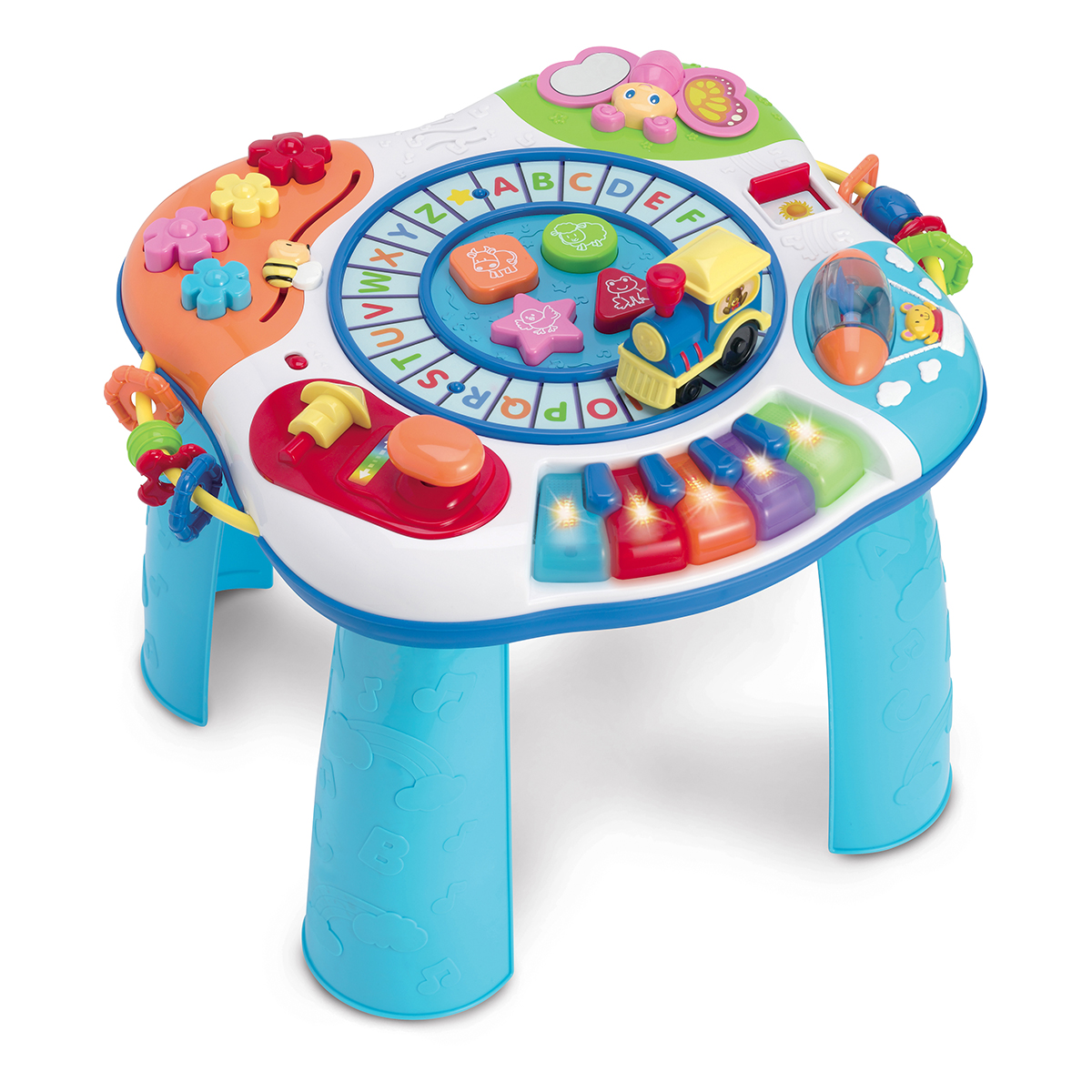 Multifunkční stoleček nabízí opravdu hodně – pětitónové klávesové pianko s blikajícími světly a s písničkami a především zábavný vláček s volnoběhem, který píská a jeho koleje jsou vlastně abecedou, takže lokomotiva při jízdě spouští abecední písničku. Je tu i řadicí páčka, točítko, posuvná včela a mávající motýl, opatření legračními frázemi, zvukovými efekty i hudbou.